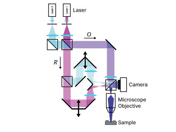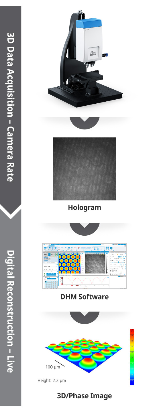 DHM is the digital extension of classical holography. It is a patented technology that records holograms with a digital camera rather than on a photographic plate. A numerical processing replaces the classical re-illumination process to retrieve, in real time, the phase and intensity changes induced by the imaged sample. This information is then interpreted to retrieve the sample topography.