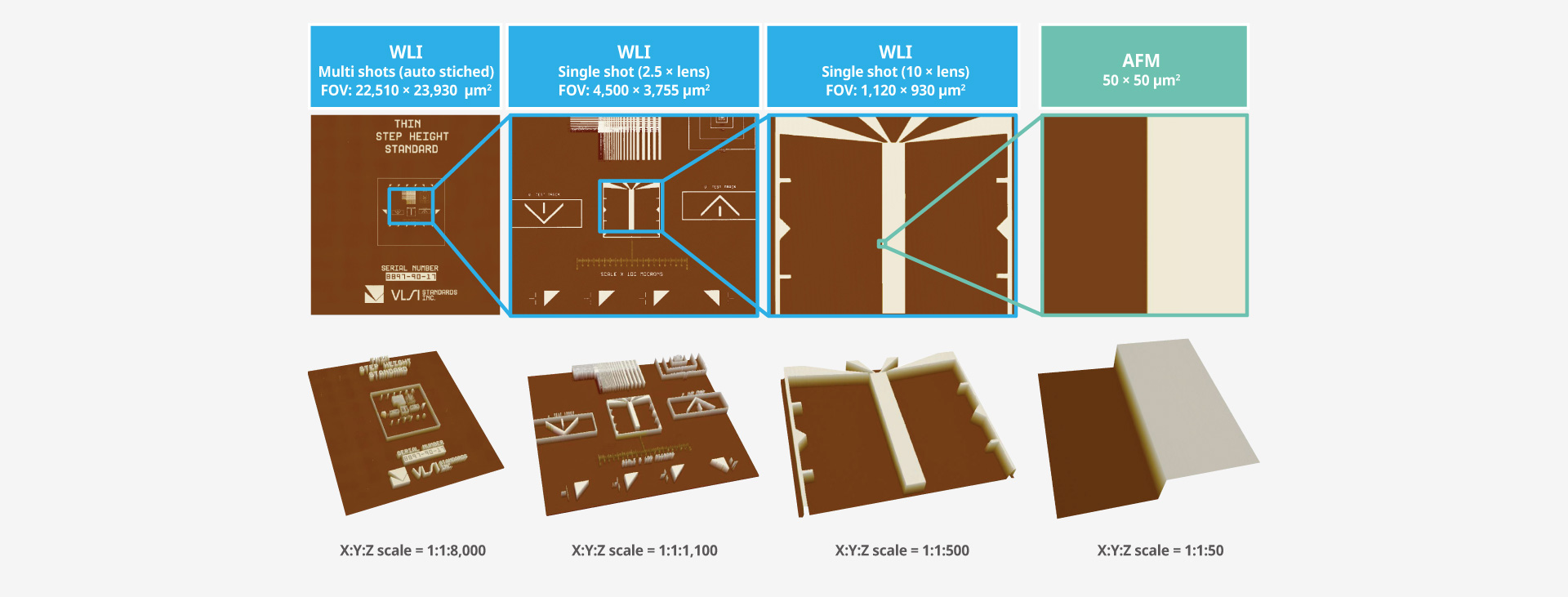 NX-Hybrid WLI supports both WLI and PSI modes, covering a wide Z range from sub-nanometer to tens of micrometers.