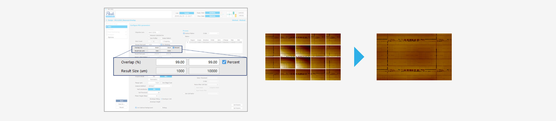 The system integrates dual-mode interferometry (WLI and PSI), supporting a wide Z measurement range from sub-nanometer to tens of micrometers. A motorized linear lens changer enables automatic switching between two objective lenses from a range of 2.5×, 10×, 20×, 50×, and 100×, allowing flexible measurement configurations for various inspection requirements and improved throughput. In addition, automatic stitching precisely aligns adjacent images during large-area scans, minimizing overlap errors and distortion while reducing the need for manual realignment.