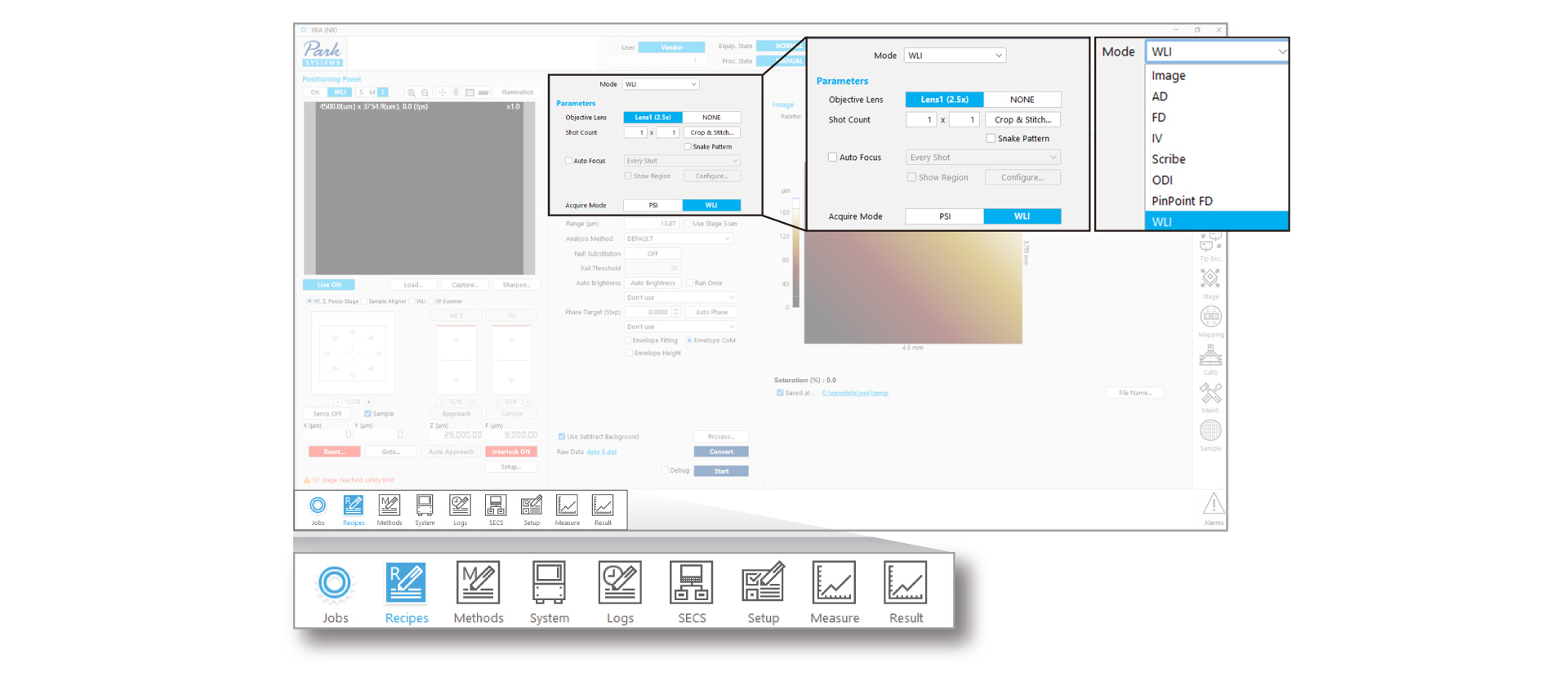 XEA software integrates AFM and WLI measurement and analysis into a single automated workflow, enabling seamless mode switching within a single recipe. It offers practical features such as easy recipe copy and paste, specialized editing modes, and real-time recipe updates. Built-in functions support comprehensive system operations, including parameter adjustment, database management, and maintenance, while maintaining an intuitive and user-friendly interface. The navigator provides an intuitive user interface that integrates system adjustment and operation.