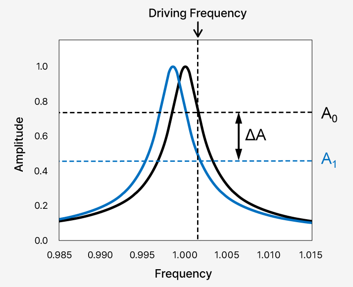 As the tip approaches the sample, the attractive force causes a downshift in the effective resonance frequency, leading to a decrease in oscillation amplitude at the driving frequency. The Z-servo maintains this new amplitude, keeping a constant tip-sample interaction while the tip scans in the XY direction.