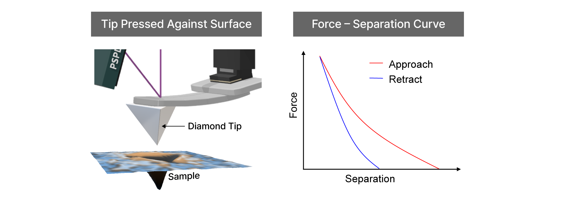 A stiff AFM cantilever equipped with a diamond tip contacts the sample in a controlled manner while the applied force and resulting indentation depth are recorded. This process generates a force–separation curve from which Young’s modulus and hardness (The resistance to permanent deformation) can be calculated, most commonly using the Oliver–Pharr model.