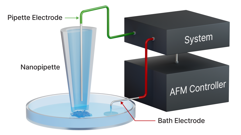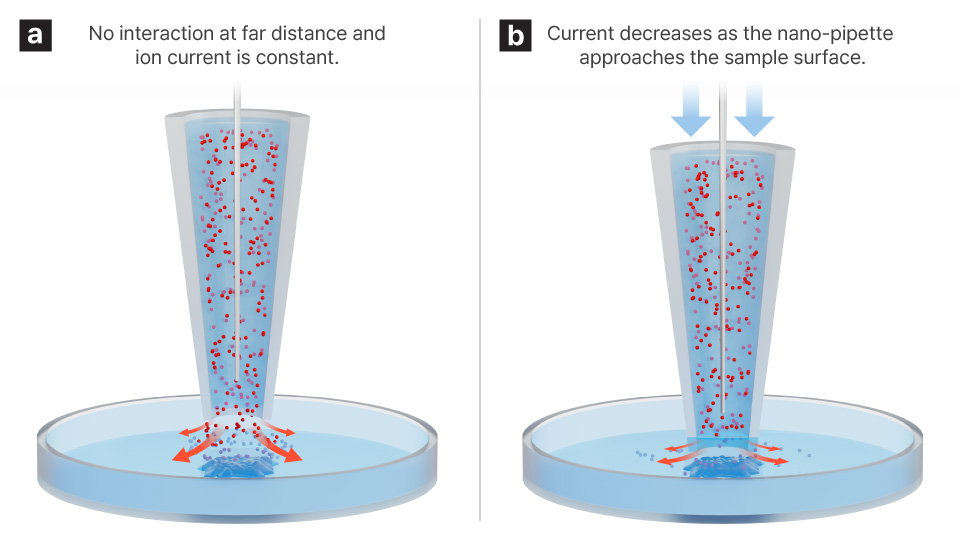 Non-contact topographical imaging using a nanopipette to measure ion current changes, mapping surface structure via ion conductance feedback without physical contact