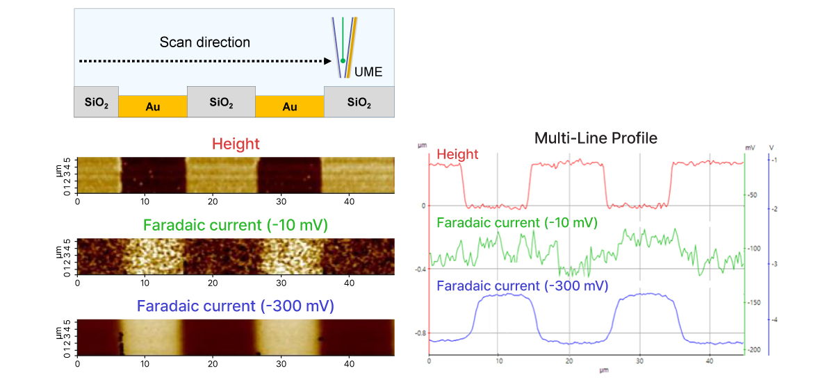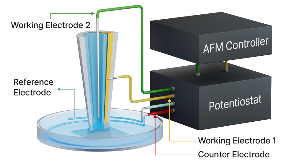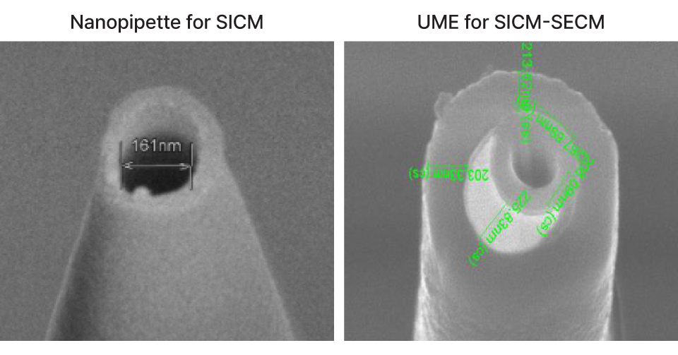 Combines SICM with SECM for simultaneous surface topography and electrochemical activity imaging