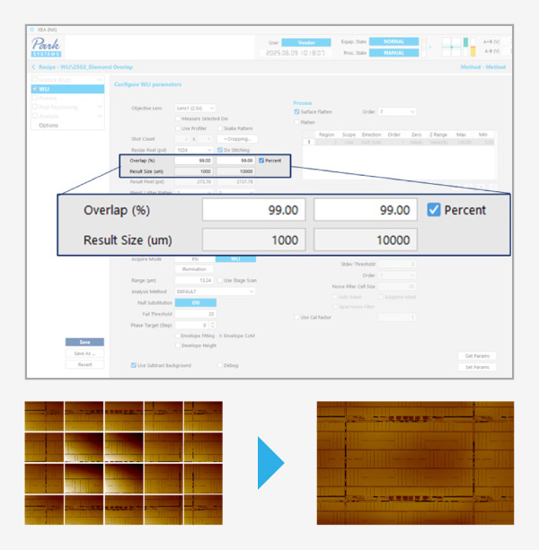 The system integrates dual-mode interferometry (WLI and PSI), supporting a wide Z measurement range from sub-nanometer to tens of micrometers. A motorized linear lens changer enables automatic switching between two objective lenses from a range of 2.5×, 10×, 20×, 50×, and 100×, allowing flexible measurement configurations for various inspection requirements and improved throughput. In addition, automatic stitching precisely aligns adjacent images during large-area scans, minimizing overlap errors and distortion while reducing the need for manual realignment.