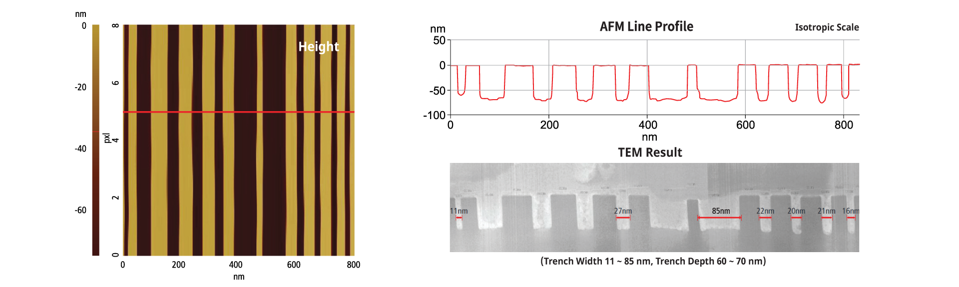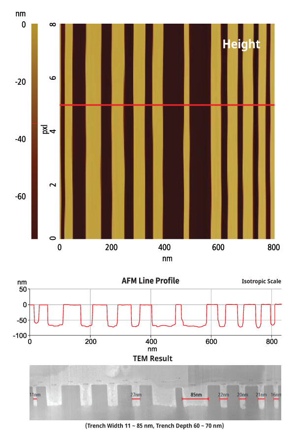 Park AFM technology can measure high aspect ratio and nanometer-scale trenches in advanced semiconductor processes. Narrow trench mode (NTM) is optimized for nanometer-scale trench measurements. The data below show excellent NTM measurement results for nanometer-scale trenches with various aspect ratios. Specialized tips are available for specific requirements.