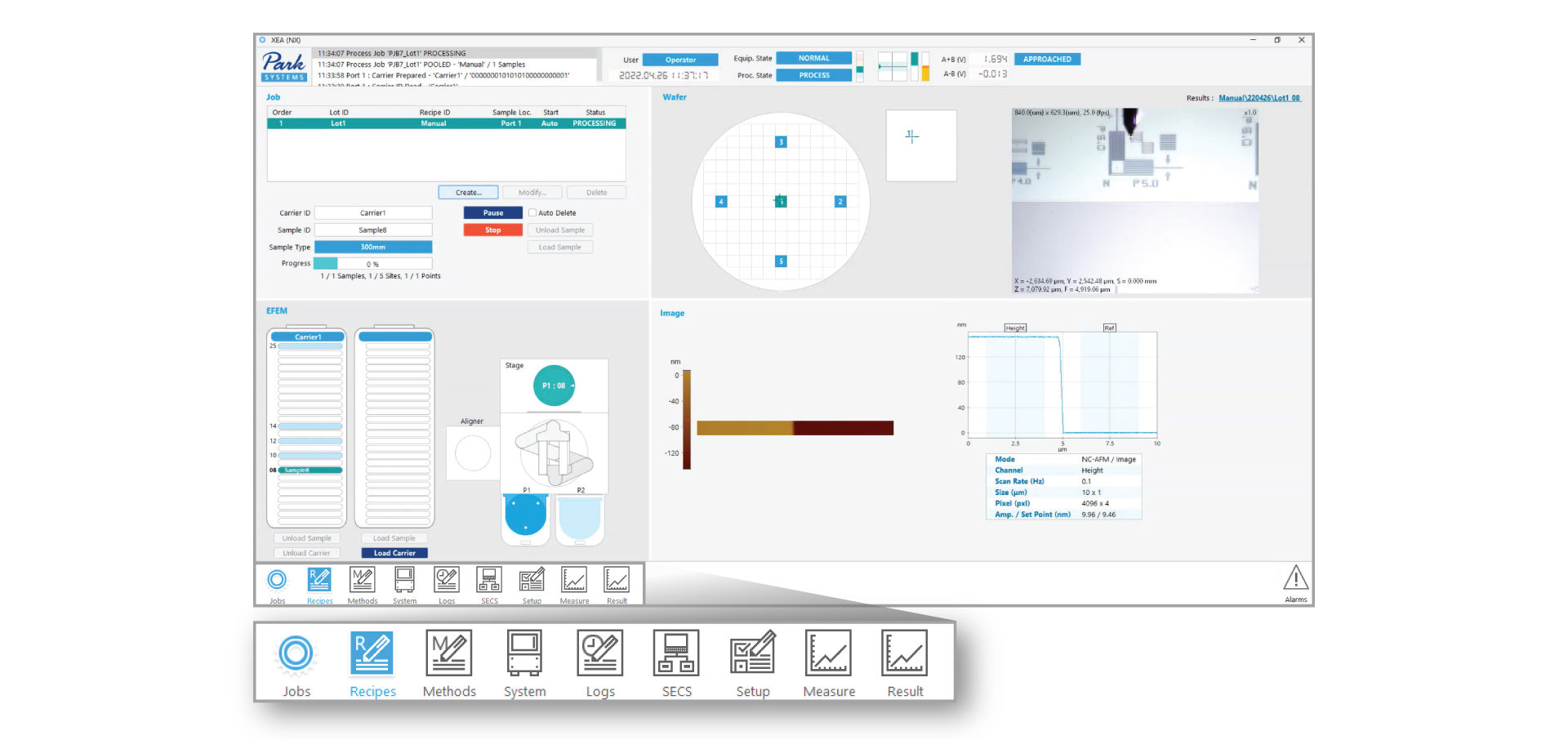 NX-Wafer enables fully automated operation from wafer handling to measurement and analysis. It automatically receives a recipe from the host, performs end-to-end automation by selecting the appropriate tip, scanning multiple target areas, analyzing the data, and generating reports.