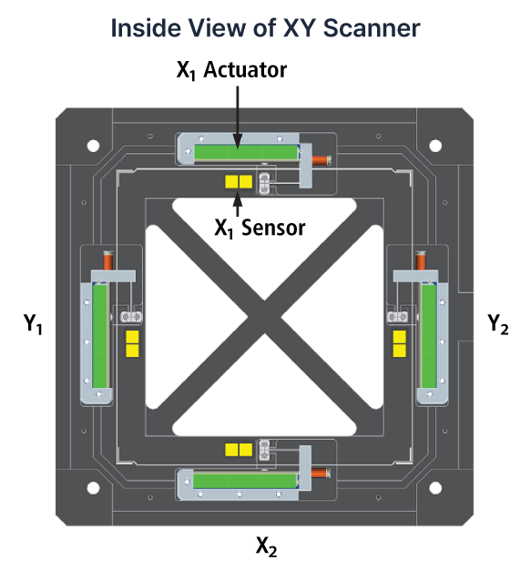 The XY scanner features a dual-servo architecture with two pairs of actuators and position sensors mounted on opposite sides of each axis, providing
