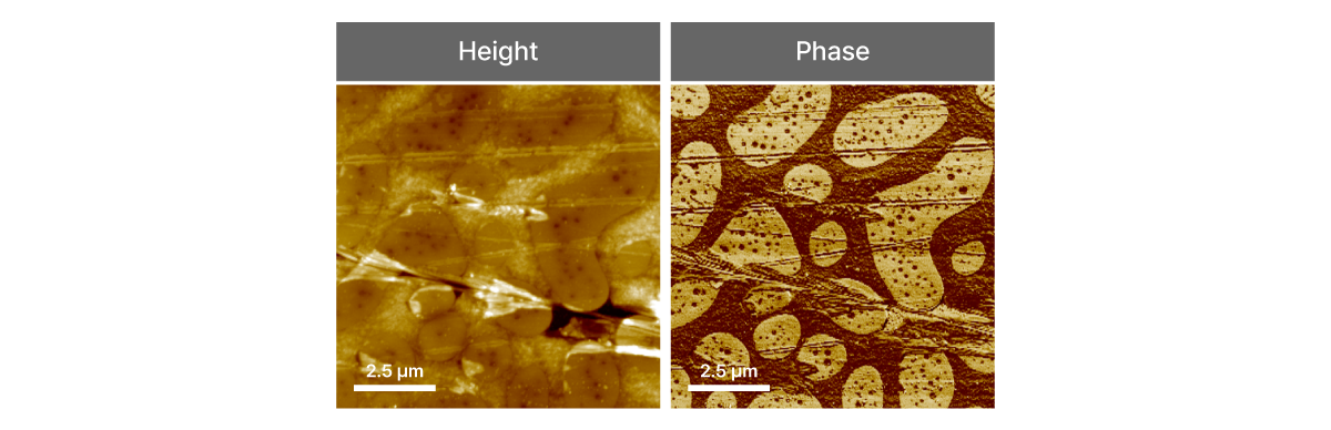 Tapping mode is ideal for studying complex polymer systems, such as blended polystyrene and polyvinyl acetate (PS-PVAc) films. As shown in the images, phase imaging in Tapping mode distinctly reveals nanoscale domain morphology and phase separation in the polymer blend, which is not apparent in the topography data. This enables precise identification of individual polymer components, mapping their distribution and mechanical property contrast, thus supporting advanced research in polymer physics, material engineering, and nanocomposite optimization.