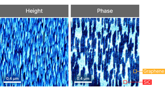 Tapping mode excels in distinguishing materials with similar surface topography by leveraging phase imaging sensitivity to mechanical properties. In the figures, graphene flakes on a SiC substrate are indistinguishable in the height image, but clearly separated by phase contrast. Phase imaging by Tapping mode reveals material-specific viscoelasticity and adhesion differences, enabling effective identification and mapping of graphene versus substrate regions without relying on topographic variation. This exemplifies the value of tapping mode for studying composite nanostructures and material distributions at the nanoscale.