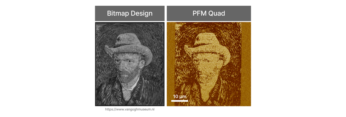 The images indicates AFM nanolithography applied to create a Vincent van Gogh image on a PZT surface by reorganizing ferroelectric domain orientation via tip bias. Using a bitmap design and controlled voltage, localized domain writing was achieved with nanometer precision, highlighting the technique’s capability to fabricate complex functional patterns for data storage, sensors, and advanced materials engineering.