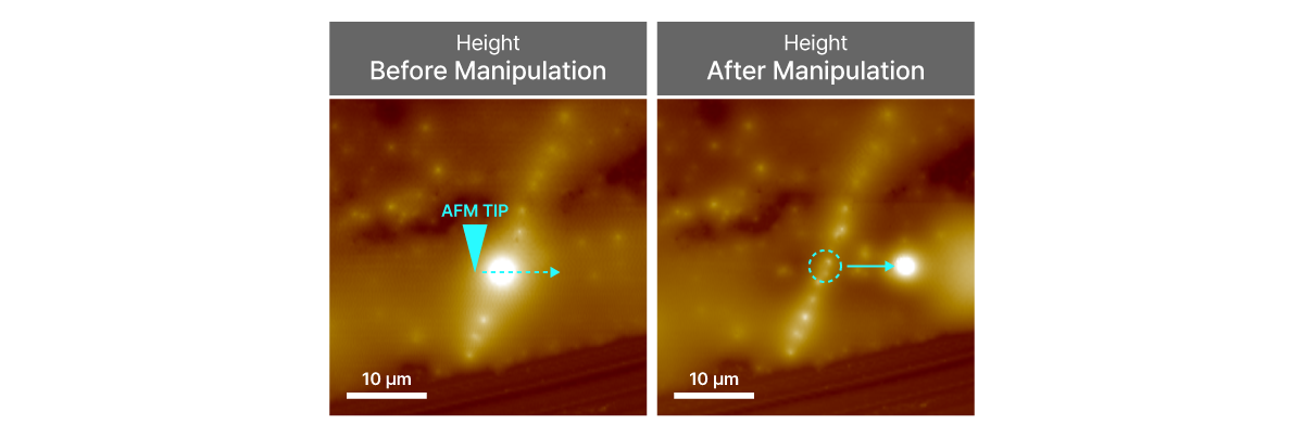 Here comes nanolithography by mechanical manipulation at the nanoscale, specifically showing controlled displacement of a silicon carbide (SiC) particle. By applying targeted force with the AFM tip, the particle was successfully shifted laterally on the substrate. This technique highlights nanolithography's capability for precision positioning and assembly of individual nano-objects.