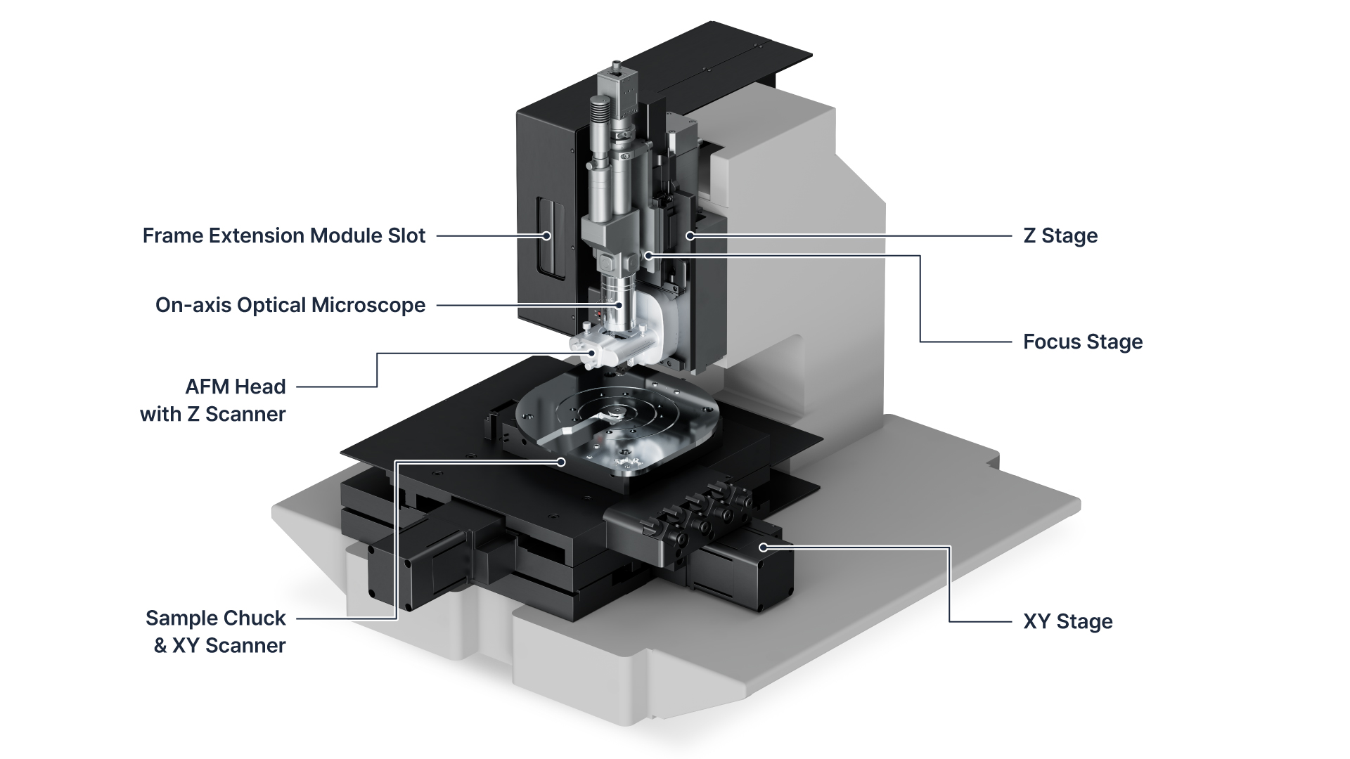 The NX20 features a direct on-axis optical microscope with integrated LED illumination, providing real-time vision of both the probe and sample. A vertically aligned, motorized Z stage and focus stage—software-controlled for automatic tip-to-sample approach—ensure precision and ease of use. The slide-to-connect AFM head with dove-tail rail allows quick setup, while an expansion slot supports advanced AFM modes and options. A motorized XY sample stage enables convenient navigation and sequential measurements across multiple coordinates, with a fine step resolution of 0.6 μm.