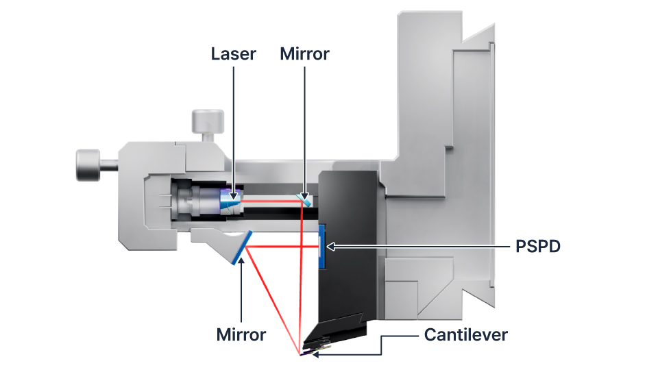 The NX head integrates a superluminescent diode that provides low coherence illumination, minimizing interference for stable signal detection. The laser beam is guided through precision mirrors to the cantilever and position-sensitive photodetector (PSPD), ensuring accurate signal alignment.