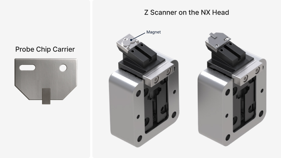 The NX head Z scanner features three precision balls for kinematic mounting, complemented by magnets at the base to ensure a secure, reliable, and repeatable mounting position.