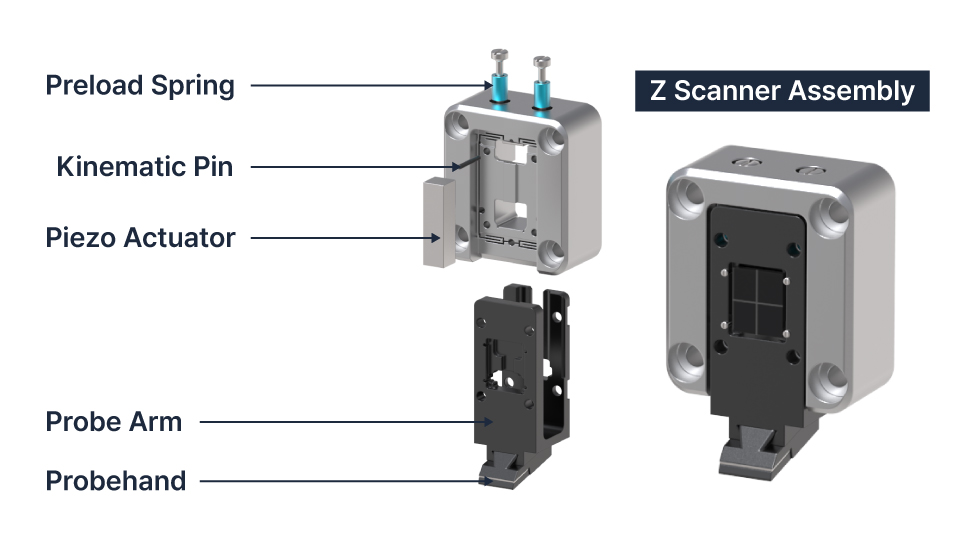 Its compact assembly, combining a preload spring, kinematic pin, and piezo actuator, minimizes drift and ensures accurate vertical motion for reliable, distortion-free nanoscale measurements.