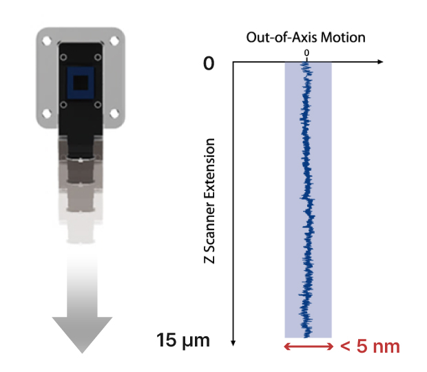 Park NX series Z scanner maintains straightness within 0.1% across the usable range, with out-of-axis motion under 5 nm even at a full 15 µm extension.