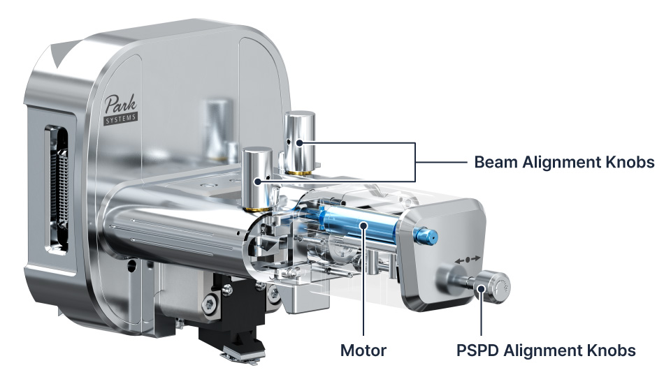 The system employs a superluminescent diode (SLD) for low-coherence illumination, minimizing optical interference and enhancing image clarity. Precise beam positioning is achieved through direct X–Y control using beam and position-sensitive photodetector (PSPD) alignment knobs. For added convenience, the PSPD A–B axis alignment can be performed under vacuum without opening the chamber.